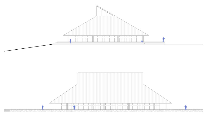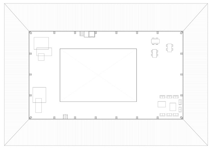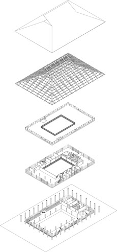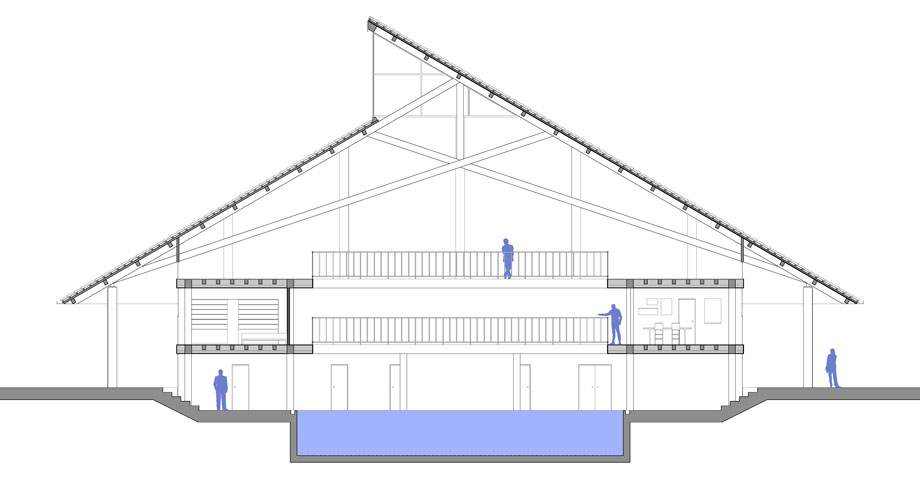Hostel with swimming pool. prof. Miguel Ángel Alonso del Val Project of a hostel with indoor pool in Mount Ezcaba of Pamplona, Navarra. The project is entirely developed in wood. It is chosen a large deck that fits the hillside. This large deck is made up scissor beams that displace the ridgepole. This movement generates a skylight that gives daylight throughout the interior. The rest of the building is organized around the pool with a very simple program.