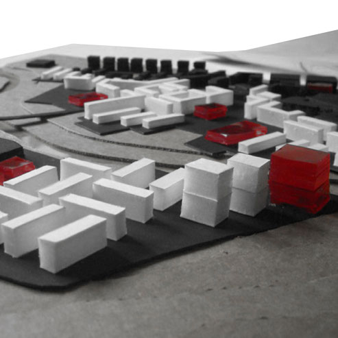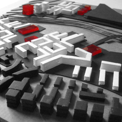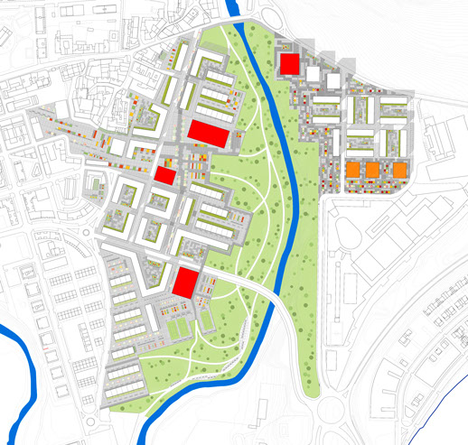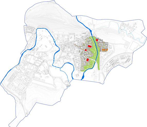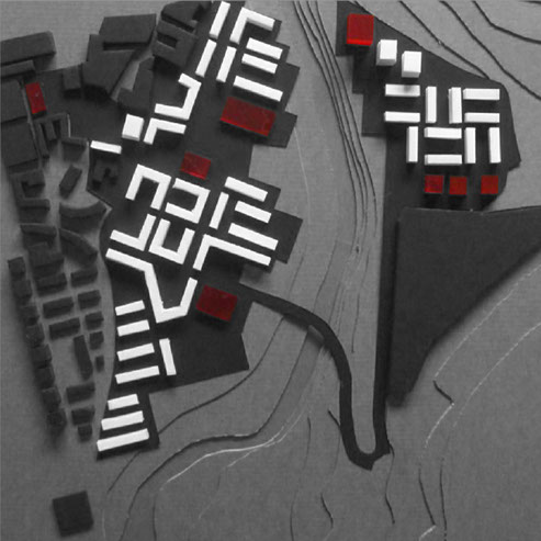 2nd prize in the ideas competition for the urban development of Huarte The town of Huarte, in Navarra, has the riverside area occupied by private orchads. The intervention consists of recovering the river to the village, through a large park and some of houses. This new disposition generates a continuity of public space that connects the main square of the village with the river.