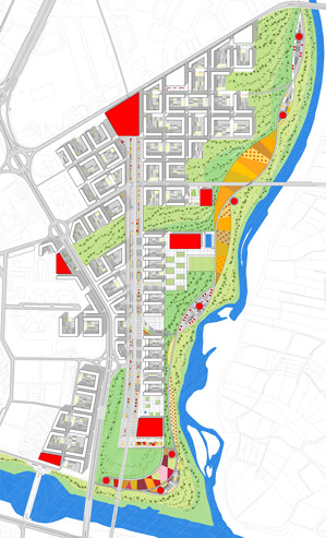 collaboration. Guillermo Montesinos, Antonio Suárez On the occasion of the exhibition Floralia to be held in Zaragoza in 2014, is proposed to develope an urban planning in an area of the city near the mouth of the river Gallego. It is an area that lives back to the river. Thus is posed a green area that will host the exhibition and serves as a transition between the city and the water. The acceses are also very important, so the train marks the axis of the planning above a large boulevard.